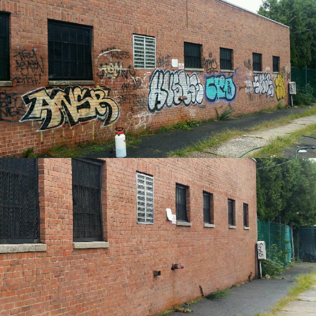 Graffiti and paint can easily be removed efficiently using our dustless blasting media restoring the surface to original.